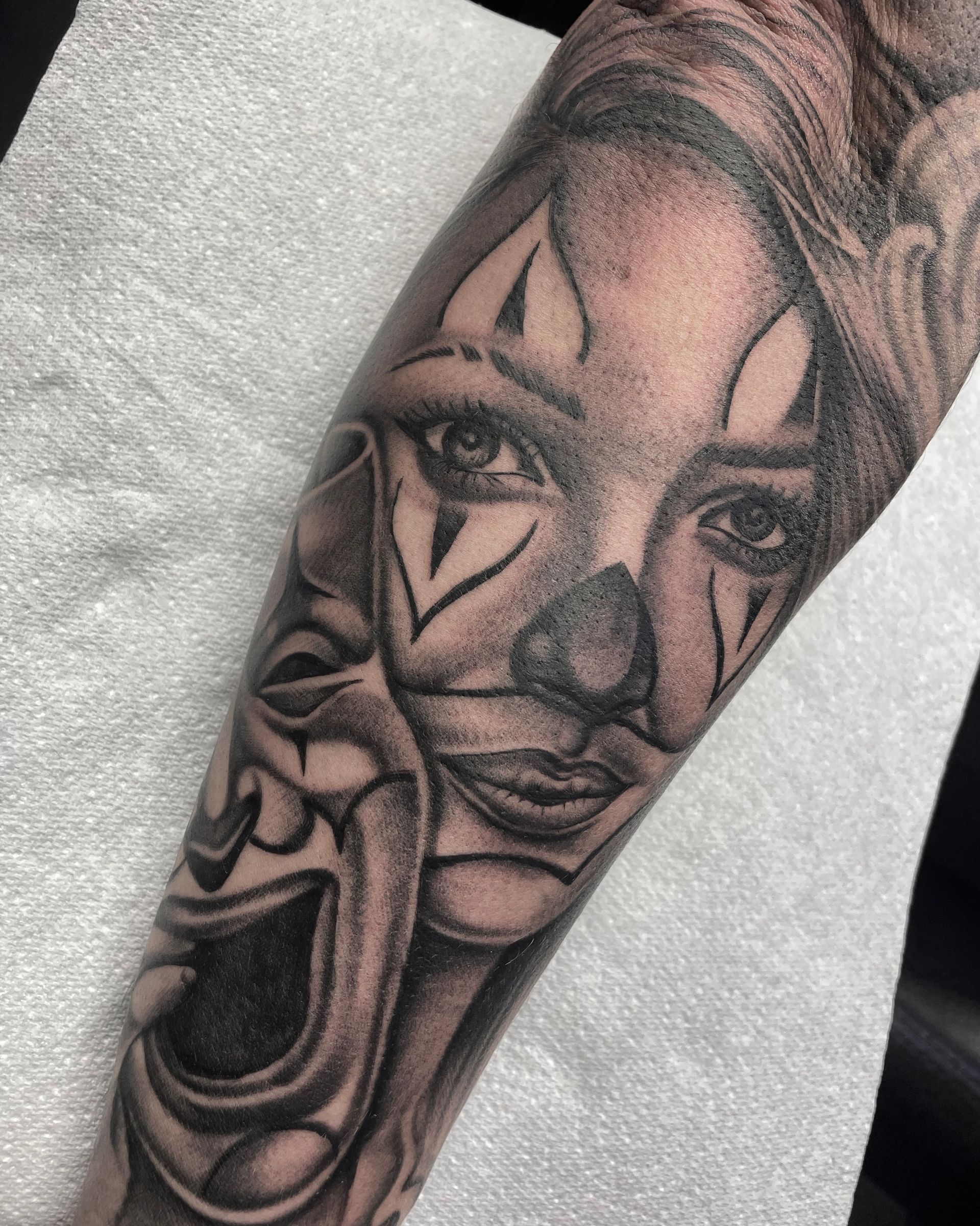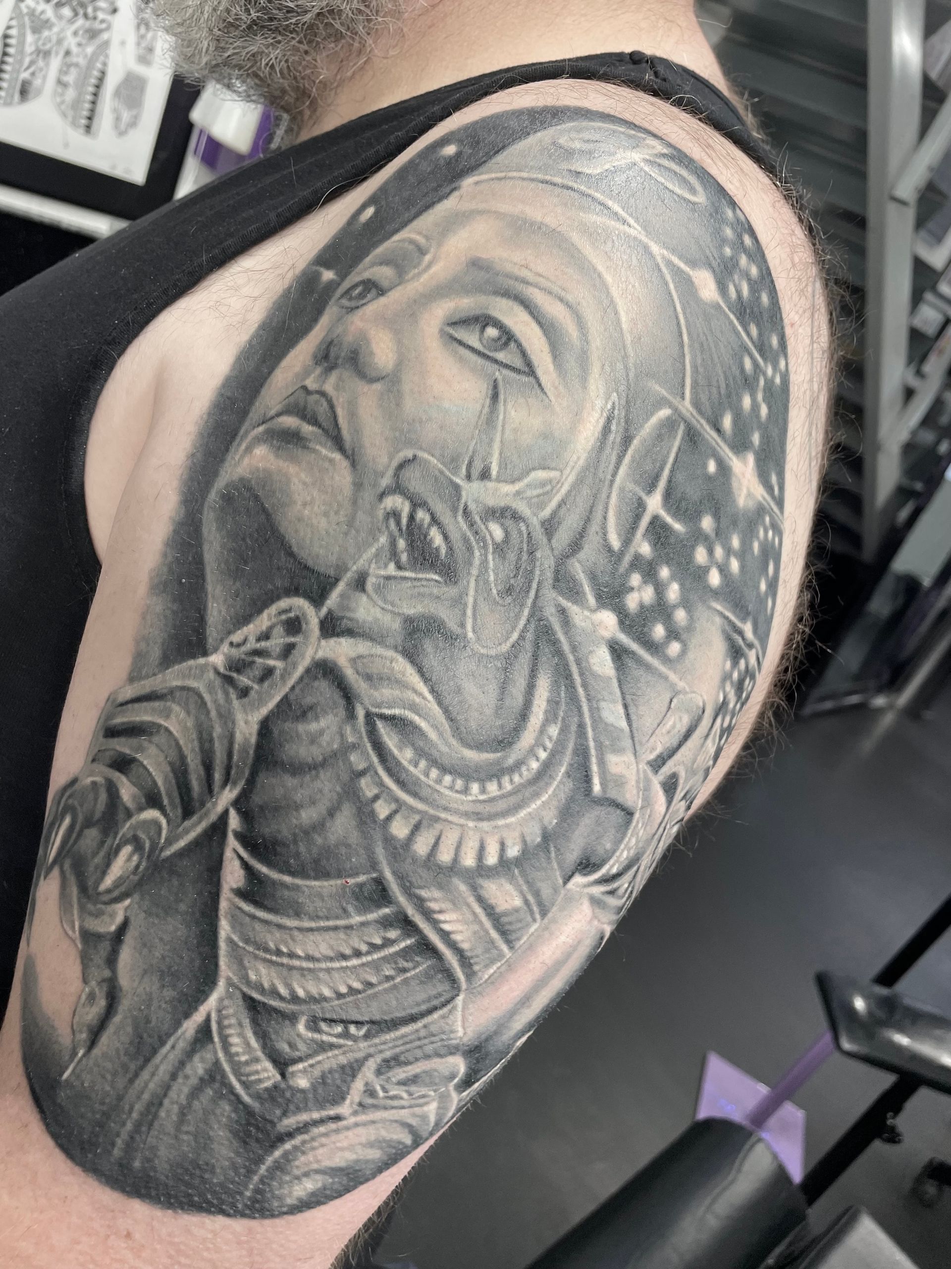 I work out of Inkfusion, the studio I founded in 2011. It’s become more than a workspace—it’s a creative hub filled with good energy. I’m also a regular guest artist at The Studio in Bristol, working alongside fellow Sullen UK artists. If you’re into bold black and grey with a strong narrative feel, you’re in the right place.